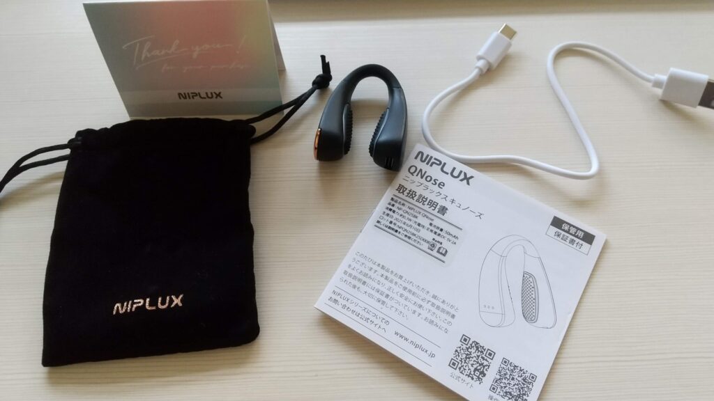 キュノーズの本体、収納ポーチ、USB充電コード、取扱説明書兼保証書が入っていました。