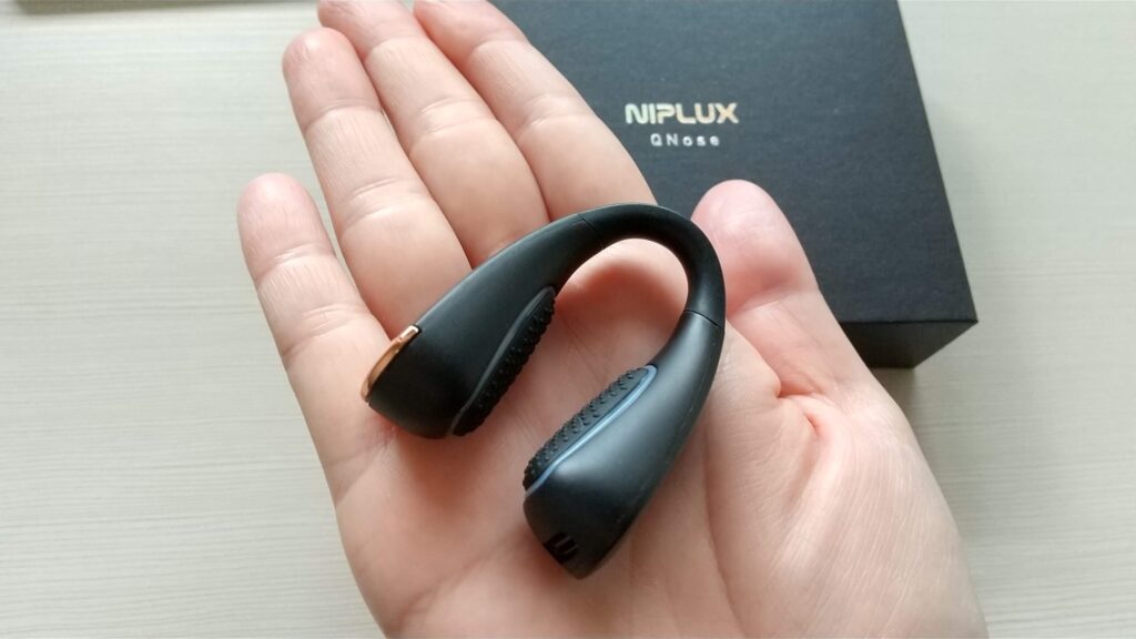 QNose(キュノーズ)は装着型の設計になっており、手で持たなくても鼻にフィットするので、家事やスマホ操作をしながら使えます。